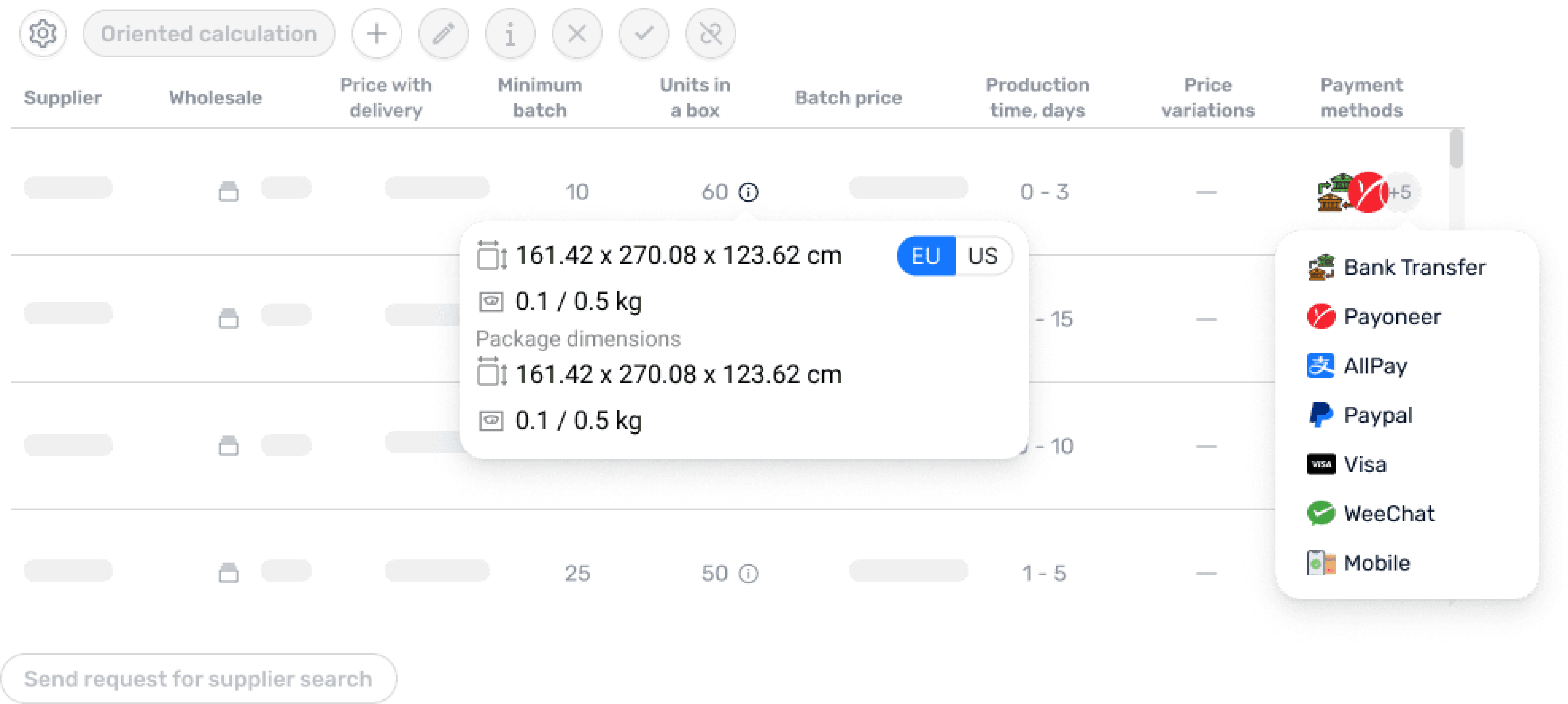 Compare shipment specs, delivery costs, and supported payment methods in one view. Choose the most efficient route for your supply chain.
